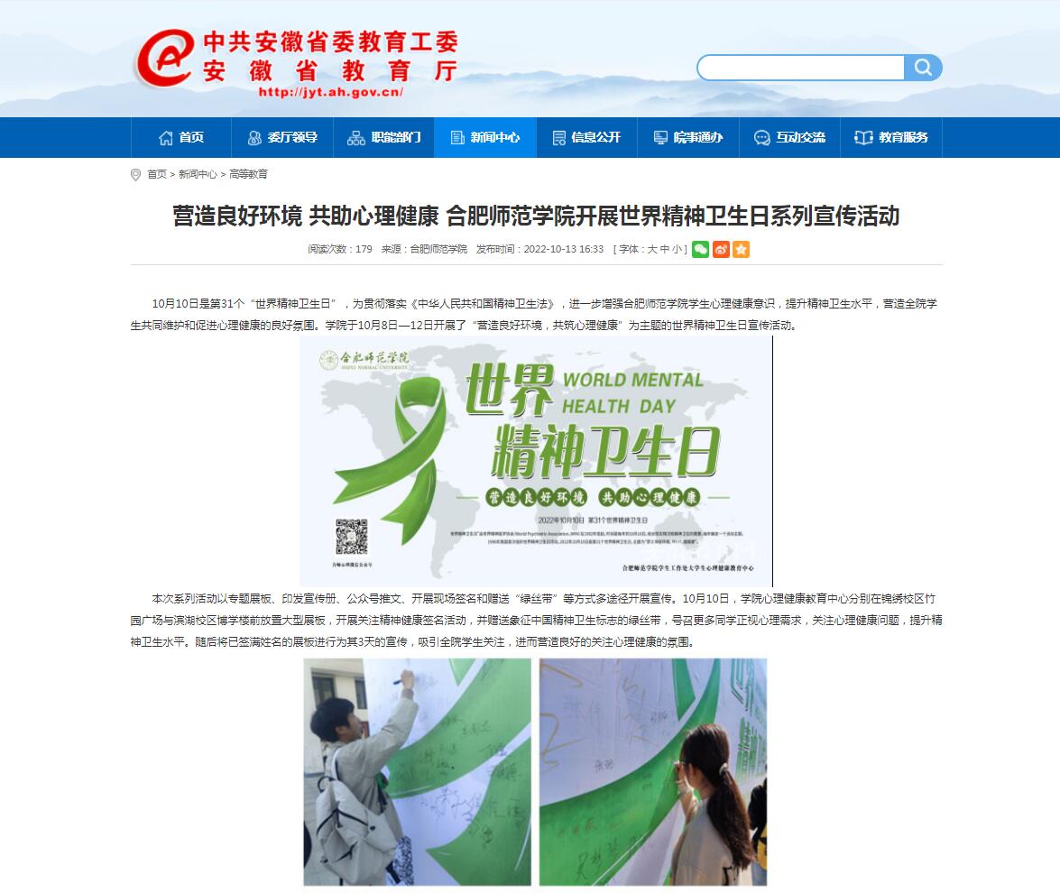 10月13日,安徽教育网首页以《营造良好环境 共助心理健康 388vip太阳集团开展世界精神卫生日系列宣传活动》为标题进行了报道。