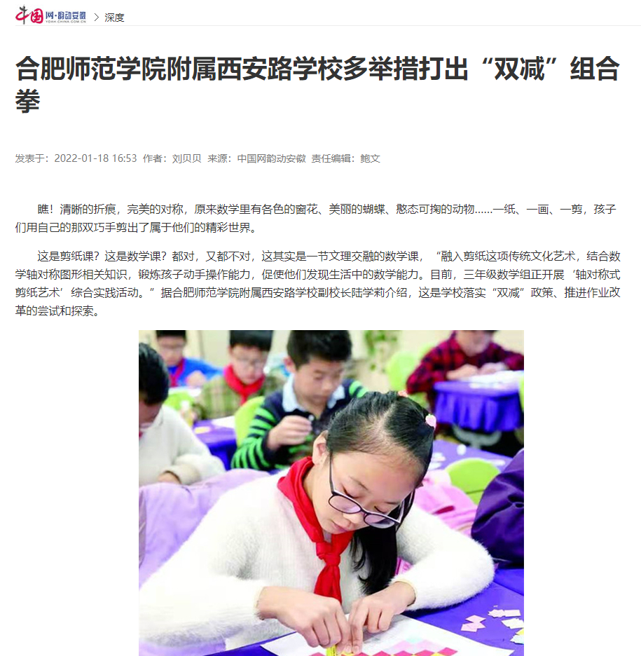 1月14日,《江淮晨报》A07版以《双减之下,合肥这所学校的作业设计让人慕了》对此进行了报道。(新闻中心)