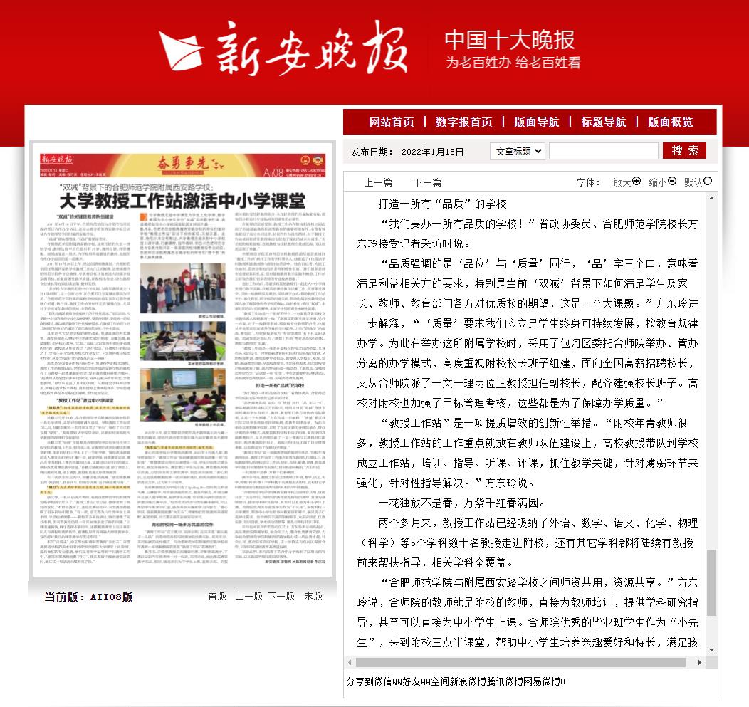 1月18日,《新安晚报》、安徽网以《“双减”背景下的388vip太阳集团附属西安路学校:大学教授工作站激活中小学课堂》为题,对此进行了报道。1月18日,中国网韵动安徽频道以《388vip太阳集团附属西安路学校多举措打出“双减”组合拳》为题,对此进行了报道。