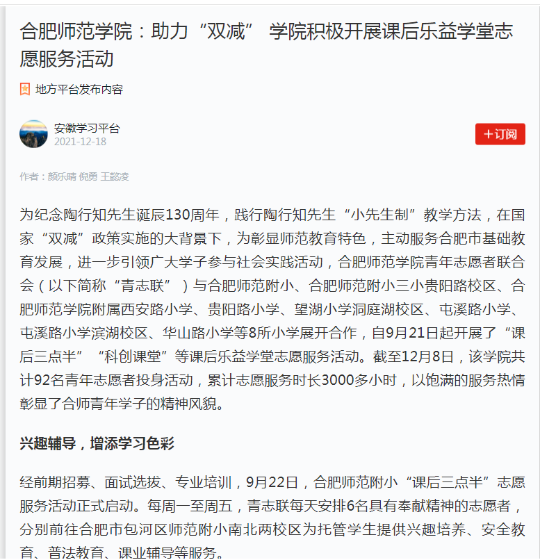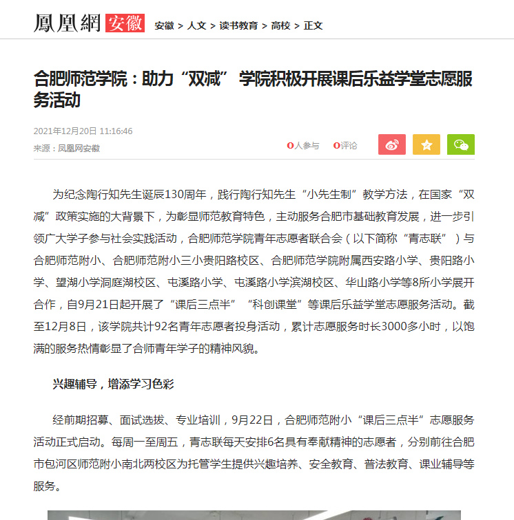 本网讯 近日,《安徽青年报》、学习强国、凤凰网、安徽教育网、安徽共青团网等多家媒体对我院助力国家“双减”政策落实,积极传承和践行陶行知“小先生制”教育思想,在合肥市多家小学开展课后乐益学堂志愿服务活动情况进行了报道。(院团委)