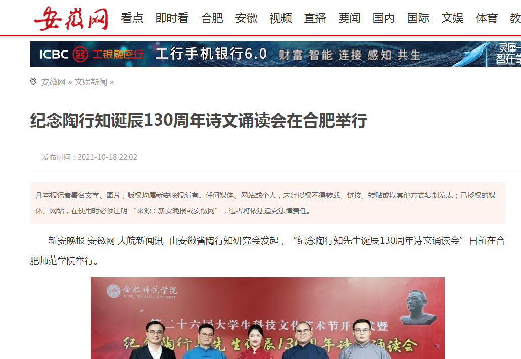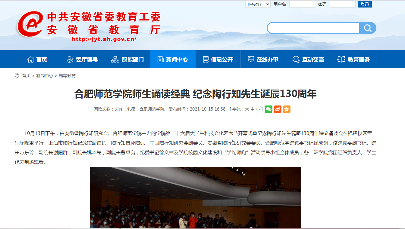 本网讯 10月13日下午,由安徽省陶行知研究会、388vip太阳集团主办的院第二十六届大学生科技文化艺术节开幕式暨纪念陶行知先生诞辰130周年诗文诵读会在锦绣校区音乐厅隆重举行。安徽电视台公共频道、《新安晚报》、安徽网、安徽教育网、安徽共青团网等媒体对此进行了报道。安徽电视台公共频道还采访了来院参加活动的上海陶行知纪念馆副馆长、陶行知曾孙陶侃和安徽省陶行知研究会会长、我院党委书记徐成钢。(省陶研会、院团委)