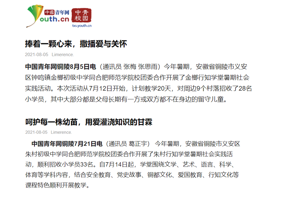 中国青年网报道院团委铜陵行知学堂