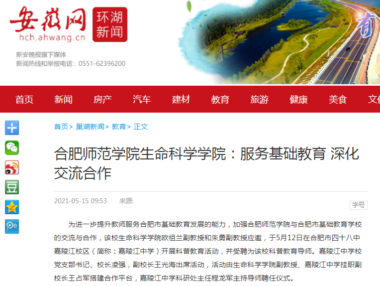 5月15日,安徽网对此进行了报道。(生命科学学院)