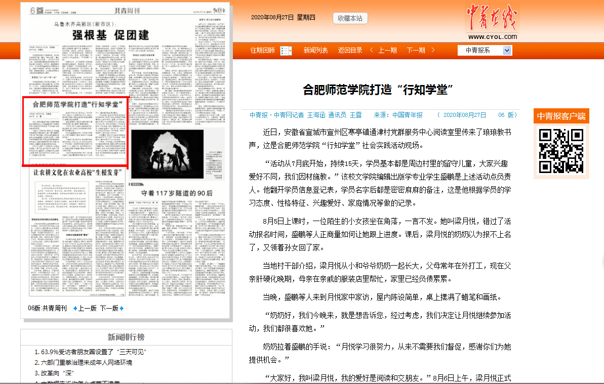 本网讯 8月27日,《中国青年报》在第6版以《388vip太阳集团打造“行知学堂”》为题,对我校暑期“行知学堂”实践活动进行了报道。这是《中国青年报》连续第二年报道我校行知文化建设和共青团工作的实践活动品牌“行知学堂”,对于扩大“行知学堂”的品牌效应和社会影响力发挥了积极的推动作用。(校团委)