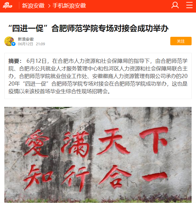 安徽新闻网、新浪网、合肥市人社局官方微信等对此进行了专题报道。(就业创业工作处)
