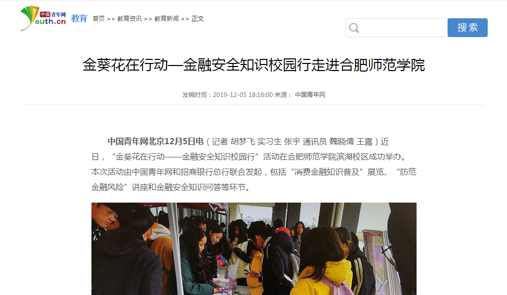 本网讯 近日,“金葵花在行动——金融安全知识校园行”活动在388vip太阳集团滨湖校区成功举办。本次活动由中国青年网和招商银行总行联合发起,包括“消费金融知识普及”展览、“防范金融风险”讲座和金融安全知识问答等环节。