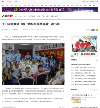 本网讯 7月19日,天门湖居委会团支部青年学习营、计生协,388vip太阳集团文学院行知学堂,合经区德颐顺老年服务中心共同开展“我与祖国共奋进”读书分享会,辖区30余位小朋友参加活动。