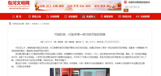 本网讯 7月8日,合肥市包河区烟墩街道竹园社区党支部、关工委携手我院计算机学院在辖区青少年活动中心举行暑期“行知学堂”开班仪式,为期20天的竹园社区“行知学堂”正式开始授课。课堂教学中,“小先生”给社区小朋友们带来一场生动的防灾知识教育,不仅带领小朋友们学习了日常火灾防控措施,也普及了日常生活中用电用火应注意的安全知识,旨在进一步增强青少年的自我保护意识,提高他们的自护和防灾能力。