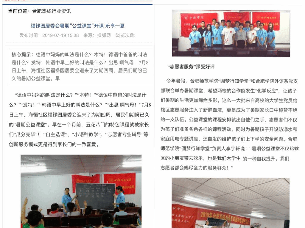 搜狐网、合肥热线报道我院福禄园居委会“行知学堂”