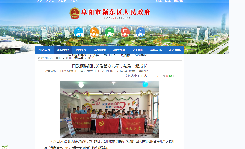 阜阳市颍东区人民政府官网两次报道我院“行知学堂”活动
