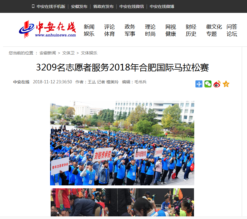 本网讯 11月11日,2018年合肥国际马拉松赛在合肥举行,我院负责提供本次大赛全部志愿者,共有3209名同学参与大赛各项志愿服务。中青在线、中安在线、新浪网等多家媒体对此进行了报道。(院团委)
