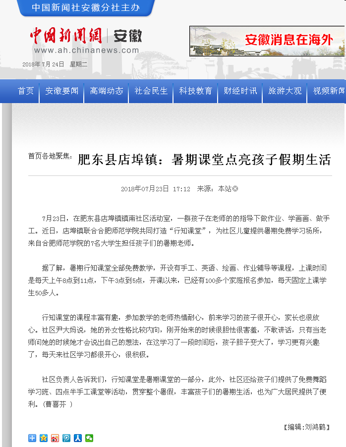 本网讯 7月23日,中国新闻网安徽分社、肥东县微信公众号对我院经济与管理学院17级经济学班行知学堂进行了报道。(经济与管理学院)