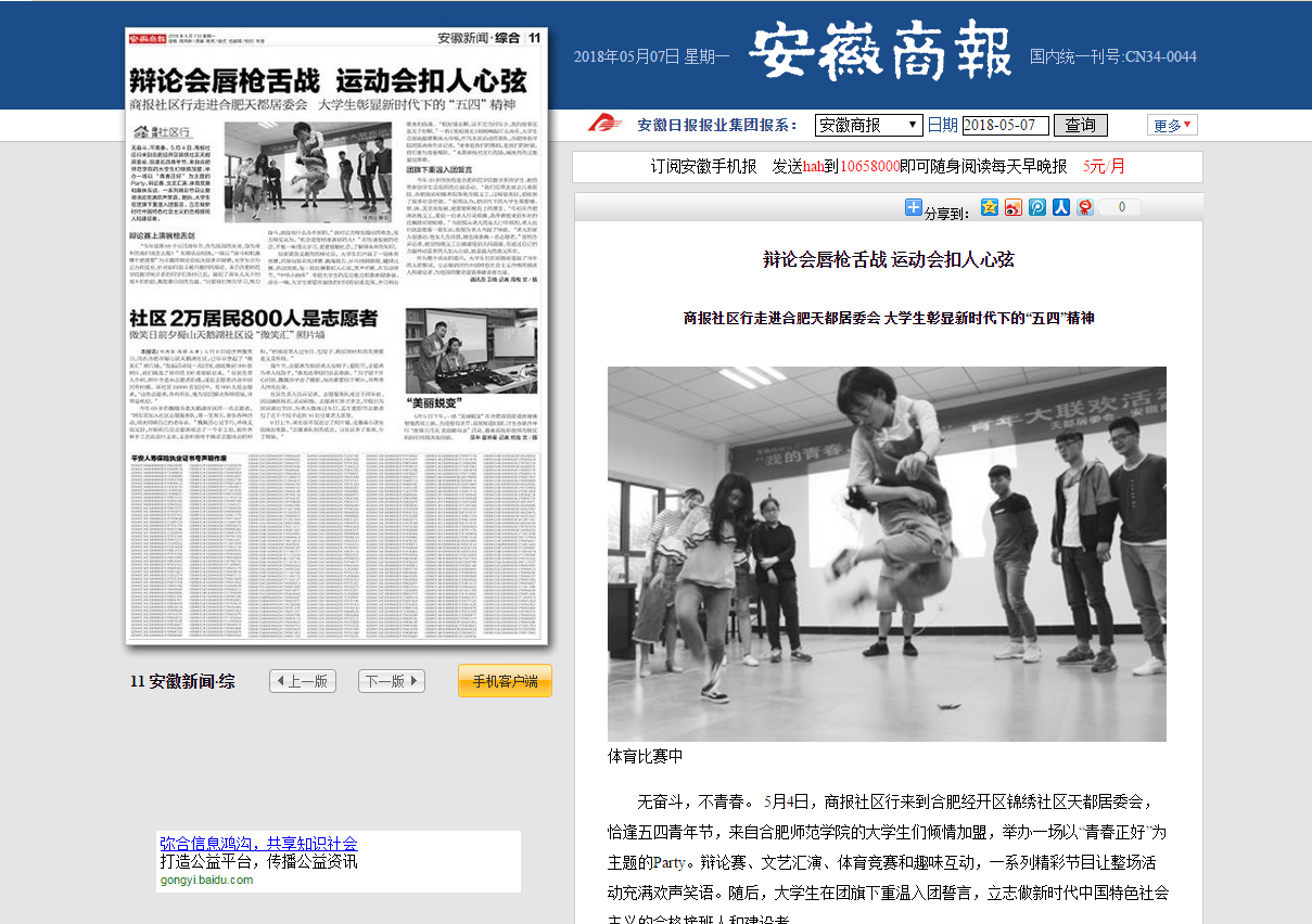本网讯 5月7日,安徽商报以较大版面报道了我校数学与统计学院分团委与锦绣社区团委、天都居委会团支部联合举办的五四青年节主题活动。恰逢第69个五四青年节来临之际,5月3日、4日,来自388vip太阳集团数学与统计学院的大学生走进社区,和天都居委的青年一起开展了以“无青春 不奋斗”为主题的辩论赛和以“青春正好”为主题的青年联谊会。辩论赛、文艺汇演、体育竞赛和趣味互动,一系列精彩节目让整场活动充满欢声笑语。随后,大学生在团旗下重温入团誓词,立志做新时代中国特色社会主义的合格建设者和接班人。(数学与统计学院:周倩)