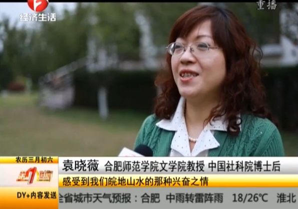 本网讯 4月18日、20日、21日、22日,安徽经济生活频道“第一时间”栏目连续播出了四期特别策划报道《诗词中的安徽》,我校文学院教授袁晓薇作为专家接受访谈,带领观众穿越历史时空,重温经典诗词,游览安徽山水。节目中,袁晓薇教授介绍了唐代大诗人李白在安徽的行踪和歌咏皖南山水胜景的名作,并对著名诗人杜牧的《清明》进行了评析。袁晓薇教授专业的点评彰显了节目的文化内涵,有效宣传了安徽历史文化和旅游资源,产生了积极的社会效应。(文学院)