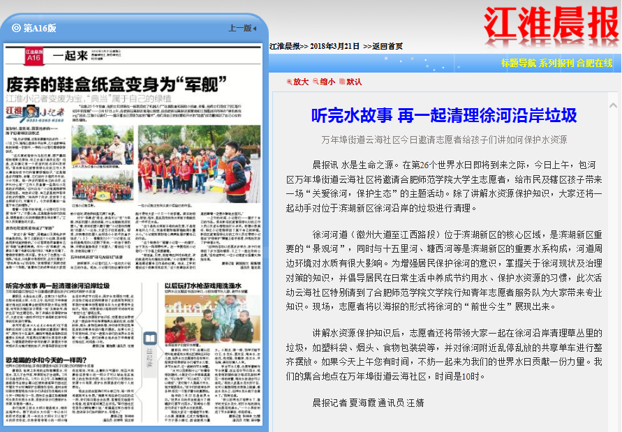 本网讯 3月21日,文学院组织新媒体系学生党支部和编辑学系学生党支部的部分学生党员赴滨湖新区万年埠街道云海社区开展“关爱徐河,保护生态”志愿服务活动。3月21日,《江淮晨报》以“听完水故事,再一起清理徐河沿岸垃圾”为题进行了报道。3月22日,《江淮晨报》再以“徐河水清澈了,我们生活环境会更美”为题,对活动进行了跟踪报道。(文学院:叶枫)