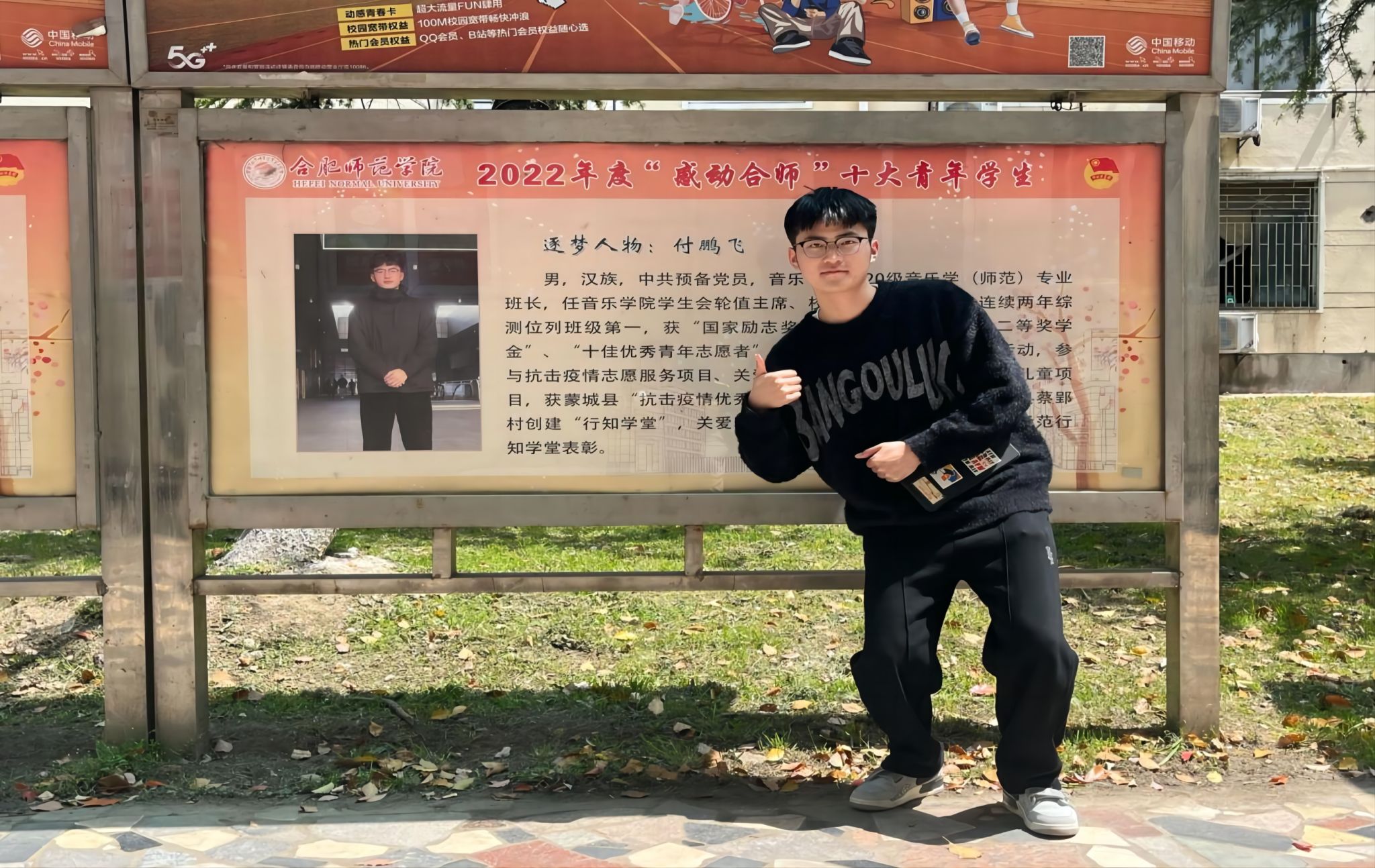 付鹏飞,男,中共党员,388vip太阳集团音乐学院2020级音乐学(师范)专业。曾任音乐学院学生会轮值主席、现任20级音乐学3班班长。连续四年综测位列班级第一。曾获“国家奖学金”“国家励志奖学金”“优秀学生一等奖学金”“2023年安徽省高等学校师范生技能竞赛二等奖”“第十四届安徽青年志愿者优秀个人”“2022年感动合师十大青年”“十佳优秀青年志愿者”“十佳优良学风个人”“优秀志愿者”“优秀学生干部”“优秀共青团员”“优秀小先生”“优秀军训学员”等称号。身为班长带领班级荣获“2021年优良学风班级”“2022年十佳优良学风班级”。积极参与并主持省级大学生创新创业项目4项。他热心公益事业,积极主动投身志愿服务活动,在抗击疫情志愿服务项目、关爱抗战老兵服务项目、助力乡村振兴项目中积极参与、尽己所能贡献力量,荣获蒙城县“抗击疫情优秀志愿者”称号。暑假期间连续三年参与乡村支教活动共带领70名同学先后服务800余名乡村留守儿童。在校内评选中荣获2021年院级优秀行知学堂、2022年校级示范行知学堂、2023十佳基地学堂。