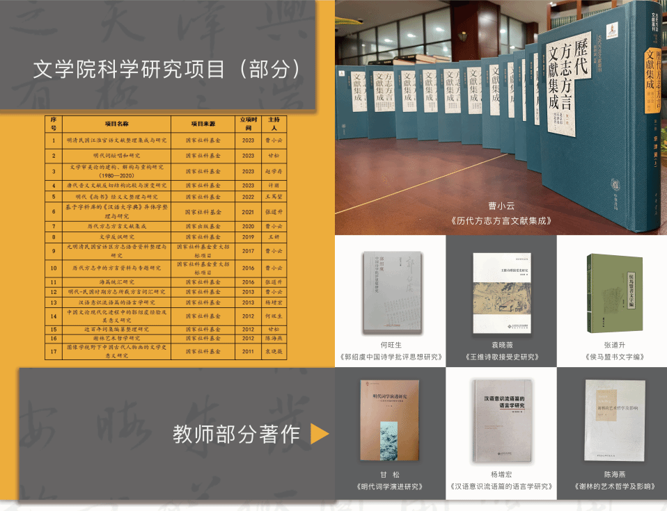 近年来,专业获批国家社科基金项目17项,省部级项目31项,发表高水平论文100余篇,出版学术专著与教材30余部,获安徽省教学成果特等奖1项、一等奖1项,二等奖、三等奖多项。